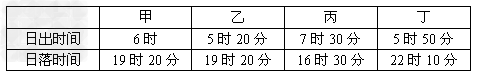 5、单选题 下表是12月22日甲、乙、丙、丁四地的日出日落时间(均为北京时间)表。据此回答1—3题。?