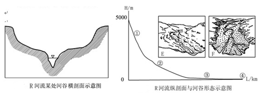 1.左图中,形成该河谷的地质作用依次是2.右图中,E、F示意的河谷形态分别出现在河流的