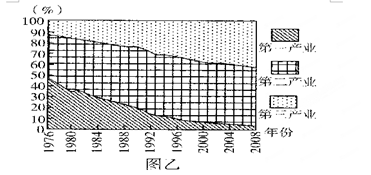 3、单选题 读我国东部沿海某地区城市分布图(图甲)和该地区1976年—2008年产业结构变化图(图乙),回答下列各题。