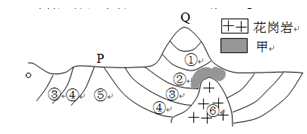 2.①→⑤岩层年龄变老;Q为向斜构造;⑥岩层年龄比③岩层新;P为背斜,是良好的油、气构造。