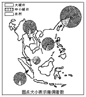5、综合题 图5—28表示设在亚洲地区的日本企业的用人规模和企业所处的自然环境。