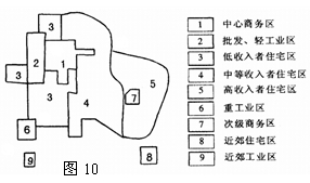 (2)B 、C 、D 、E?;地处从市中心延伸出来的干线公路和城乡外围公路交汇处,通达度相对较高,租金有所上升,形成地租次高峰