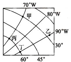【小题1】图示应是以北极为中心的俯视图中的部分区域。甲在丁的东边,丁在甲的北边,所以甲在丁的东南。选B正确。