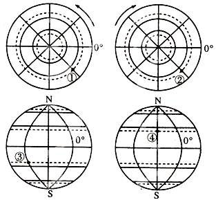 【小题2】图中四地的经纬度分别是:①23°26´N,45°W,②23°26´S,45°E,③23°26´S,90°W,④23°26´N,45°W,所以图中经纬度位置相同的两点是①④。选C正确。