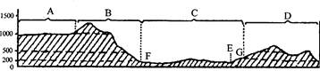 1、单选题 图为沿满洲里(49.5°N,117.5°E)——绥芬河(44.5°N,131°E)一线的地形剖面图,回答下面问题。