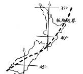 小题2:根据经纬度分析,该区域位于新西兰,属于印度洋板块,印度洋板块与太平洋板块交界处为消亡边界,印度洋板块向东南方向移动,正确答案选B.
