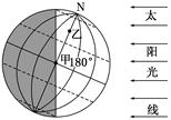 A.甲地年太阳辐射总量小的原因是该地处于洞庭湖平原,云雨天气多 B.乙地处于柴达木盆地,地势起伏大,年太阳辐射变化显著 C.甲地纬度较高,太阳高度小,到达地面的太阳辐射少 D.乙地处于地势阶梯交界处,地势起伏大,年太阳辐射变化显著 参考答案: 本题解析: 本题难度:简单 3、单选题 读中心点为地球北极的示意图,若阴影部分表示7月6日,非阴影部分为7月7日,则此时“北京时间”是( ) 参考答案:D 本题解析:由于中心极点表示北极,故自转方向呈逆时针,阴影部分表示7月6日,非阴影部分为7月7日,则分界两个日期的两条界线为0时和180°经线,结合自转方向,顺着自转方向经过0时,日期加一天,顺着自转方向经过180°经线,日期减一天。故判断NA表示7日0时;而NB表示180°经线。利用NA与NB的经度差135°,故判断NA的经度为45°W,北京时间(120°E)较45°W地方时早11个小时,故北京时间为7日11时。 本题难度:一般 4、单选题 我国某地有一口井,一年中只有一天太阳可直射井底,该地位于(? ) 参考答案:C 本题解析:因我国位于北半球,太阳可直射井底时,应是太阳直射的时候,一年之中只有一天,说明此地一年只有一次直射机会,所以此地应位于北回归线上。故选C。 本题难度:一般 5、单选题 北京时间 2011年3月11日13时46分,日本发生了里氏 9.0 级的地震。地震引发巨大海啸,造成重大人员伤亡和财产损失。据此完成问题。 参考答案:B 本题解析:北京时间为东八区的时间为3月11日13时46分,国际标准时为0时区的区时,较北京时间晚8个小时,故国际标准时为11日5时46分,A错误;3月11日,地球公转逐渐接近远日点,故公转速度不断减慢,B正确;3月11日,太阳直射点位于南半球,故北京昼短夜长,C错误。3月11日位于12月22日到3月21日之间,故太阳直射点位于南半球,并向北移,D错误。 本题难度:一般 |