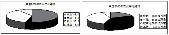 2、单选题  图是“中国2008年农业产业结构”和“中国2006年农业用地结构”图,图中数据显示我国目前的农业(?)