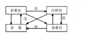 4、单选题 下图是水循环和岩石圈物质循环示意图,其中①②③代表三大类岩石。读图,完成第下列问题。