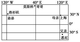 5、单选题  北京时间2012年8月13日4点,第三十届夏季奥林匹克运动会闭幕式在伦敦斯特拉特福德奥林匹克体育场举行,全球各地积极收看电视台的现场直播。其中有一家4人在不同地方同时观看直播节目,母亲在老家上海(120°51′E,30°40′N),父亲在悉尼(150°53′E,33°55′S),哥哥在莫斯科(37°37′04″E,55°45′2l″N),弟弟在洛杉矶(118°22′W,34°05′N)。据此完成小题。