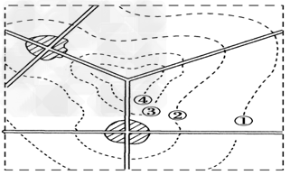 2.图中显示出等潜水位线基本与等高线起伏相似,说明潜水位随着地势的高低起伏而起伏。从等高线弯曲可以看出,左侧为一个山脊,中间是一个山谷,等潜水位线垂直穿过山脊和山谷,不能说明山脊的潜水比山谷的潜水埋藏浅。潜水的运动方向是垂直于等潜水位线,从高到低。
