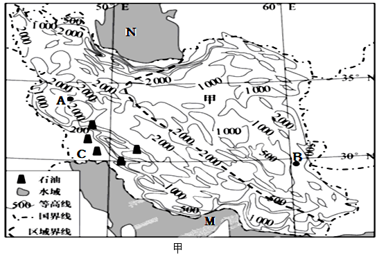 本题解析: (1)甲处地势四周高,中间低,可判断出是盆地地形。该国等高线数值较大,主要地形为高原,从其经纬度数值可以看出,该国位于亚欧板块和印度洋板块边界,板块碰撞挤压,导致地形隆起形成高原。 (2)气候特征的比较从气温高低及其季节变化和降水多少及其季节变化几个方面入手。从图中可以看出,两地均受副热带高压带和西风带交替控制,夏季高温干旱,冬季温和多雨,为地中海气候;然而,A地位于纬度较高,因此各月气温稍低,同时A点位于山地西侧,属于西风的迎风坡,冬季将于多于B地。 (3)本题考查炼油业的区位优势,一般可从原料、市场、交通运输等方面分析。从图中可以看出,C地附近石油资源丰富,同时位于沿海地区,对外交通便利,便于石油产品出口,国际市场对石油产品的需求量大。 (4)从图中轮廓可以看出,M海峡为霍尔木兹海峡,位于波斯湾的出口处,连接波斯湾和阿拉伯海,是波斯湾出入印度洋的门户,也是波斯湾沿岸石油出口的重要海上通道。 (5)从图中可以看出,该湖冬夏季均为北部盐都低,南部盐度高。影响湖泊盐度的因素主要是蒸发量、降水量和径流量,从图中可以看出,该湖泊北部有河流注入大量淡水,盐度较低,而东部和东南部气候干旱,蒸发旺盛,且没有河流注入,因此河流盐度高。 考点:地形特征和成因、气候特征比较