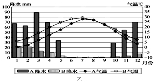 2、综合题 (28分)图甲为某国等高线地形图,图乙是图甲中A、B两地的气候资料统计图,读图,回答下列问题。