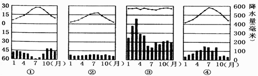 本题解析:位于纬度40°~60°之间的大陆西岸地区,全年盛行西风,深受海洋暖湿气团影响的是温带海洋性气候,与图②对应。