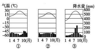 (4)下图为三种气候类型的气温曲线和降水量柱状图,把其序号与上图中气候类型的代表字母对应填空: