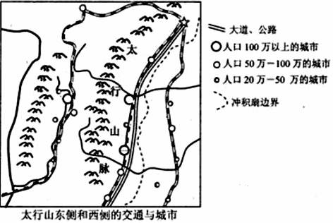 (1)简要说明太行山以西的交通线和城市的分布特点及其原因。(10分) (2)太行山以东的两条铁路线上城市的分布及规模有何差别?说明产生这种差异的原因。(10分)