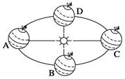 【小题2】根据提示中的地轴倾斜方向及公转方向可知,D、A、B、C依次是春夏秋冬。在地球公转由B向C运动的过程中,也就是从秋分向冬至的时间段内,太阳直射点不断南移,北半球各地昼渐短夜渐长。南半球反之,故选B。