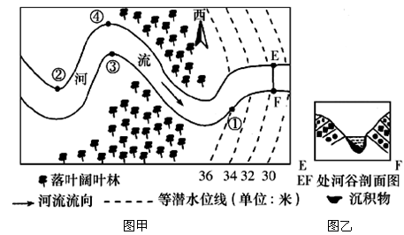 【小题2】在EF剖面处,E岸为泥沙沉积岸,F岸为侵蚀岸,故受地转偏向力的影响,河水向右偏,当地为北半球,A错。北半球大陆东岸,植被为落叶阔叶林,气候应为温带季风气候,夏季为雨季,河流的汛期,B错。因河流干流自南向北流动(自低纬流向高纬,大陆东岸温带地区冬季河流有结冰现象,故该河段在初冬、初春季节可发生凌汛现象,C正确。甲图中等潜水位线向数值低处弯曲,“凸低则高”,河流水位高于两岸地下水水位,此时河水补给地下水,D错。