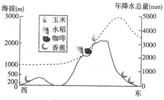 5、单选题  下图示意“某国10°N纬线附近地区的农作物分布情况”,该国农业以生产咖啡、香蕉、甘蔗等传统产品为主,是世界上第二大香蕉出口国,咖啡是该国农业第二重要产品。据此回答以下问题。