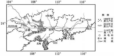 2、单选题  下图为广东、广西两省的部分地理事物分布图,读图回答下题。