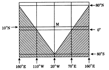 ? 点,则C点就是80°S与20°W的交点,因此太阳直射点的坐标为(10°N,20°W),如下图的M点所示,