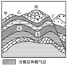 1.丁处所属地质构造可能为2.下列地点煤矿能够露天开采且比较安全的是3.从矿难成因上看,图中a、b两处最容易发生的矿难事故分别是4.丙处的地形及其形成的主要外力作用是