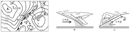 4、填空题 下面左图为“亚洲东部某日天气形势图”,右图中甲和乙为锋面示意图。读图回答下列各题。(7分)