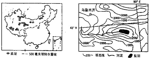 ? 湖盐是人类最早发现和食用的盐类之一,对中华文明的产生和发展有着重大影响。湖盐的生产离不开盐湖。盐湖通常指湖水含盐量大干3.5%的湖泊,除食盐(氯化钠)外盐湖还能提供石膏、芒硝、碱类等。中国是个多盐湖的国家,根据2000年的统计,我国共有盐湖1500多个。下左图是中国第四纪盐湖分布示意图,下右图是吐鲁番盆地等高线示意图。