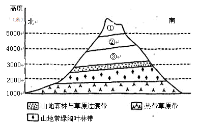 1.图上基带为热带草原带,往上为山地常绿阔叶林带、山地森林与草原过渡地带、③、②、①,垂直方向的变化与南北方向上的变化有相似之处,①②③依次代表积雪冰川带、高寒荒漠带、高山草原带。
