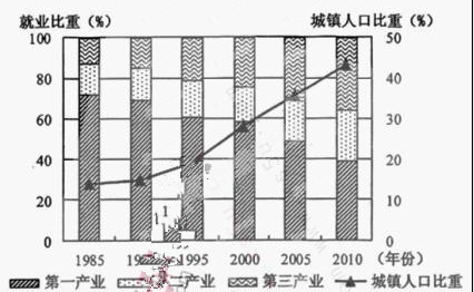 小题2:产业结构的调整,图示区第一产业比重下降,二、三产业比重上升,第三产业比重持续快速提高,第二产业上升较慢,A错。城镇新增就业人口第三产业最多,超过第二产业,B错。随着产业结构调整,一些劳动密集型企业转移到内地,农民在当地就可以打工,人口迁移到沿海的数量减少,C错。第一产业比重持续减少,人口由第一产业向第二、三产业转移,D对。
