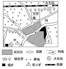 本题解析:(1)根据图示甲地位于电站附近,且有丰富的铝土矿资源,故适宜布局有色金属冶炼工业,该工业需要消耗大量电力,属于动力指向型工业。(2)图示乙地位于住宅区附近,近消费市场。(3)影响电子工业的区位可从科技、高速交通、环境和政策等方面分析。