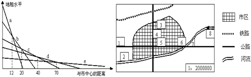 (3)根据地租水平的高低,综合考虑环保等因素,化工厂应选择在1、2、3、4四处中 的?处,选择理由是? ?。(4分) (4)图中数字代表的城市功能分区,正确的是?(选择填空)。(2分) A.5——大型超市?B.6——小麦种植?C.7——飞机场?D.8——钢铁厂 4、单选题  河流对城市的影响大,通常属于不利于城市建设和发展的区位是 5、单选题  容积率是规划用地范围内建筑物总面积与规划用地面积的比率,一般来讲,容积率越高,建筑物越高。绿地率是居住区用地范围内各类绿地的总和与居住区用地的比率。有关容积率、绿地率的叙述是 |