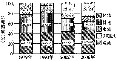 5、单选题 读我国某城市土地利用结构变化图,回答1—2题。