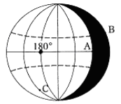 4、单选题 下图中ACB为晨昏线,C为中点。图示范围仅阴影区为黑夜,其他地区为白天。据此回答1—3题。