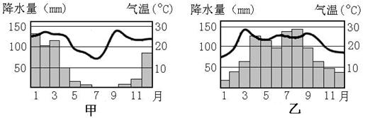(2)东非高原属于热带草原气候,一年分干湿两季;7月份北半球雨季,乙地正值草原气候的雨季,草类茂盛;而此时,地处南半球的甲地正值草原气候的干季,草类枯黄,角马大迁徙的路线大致由南向北迁移。