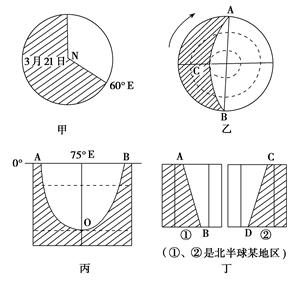 4、综合题 比较所给四幅图(注:乙、丙、丁三图中,阴影区为黑夜),完成下列问题。(11分)