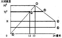 本题解析:1. 由于该经线①点的太阳高度角围900,所以该经线的地方时为12点,而此时北京时间为12:40,因此该经线为1100E,又因为②点的昼长为12小时,确定②位于赤道上,再由赤道上的太阳高度可以求出此时太阳直射在200N,①因为有太阳直射现象因此为热带地区,①的经纬度为(200N,1100E)因此位于北京的西南方向,由于这六个地区都在同一条经线上,而①②两地与④⑤两地的纬度差相等,因此距离也相等。