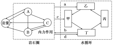 4、单选题 下图表示岩石圈与水循环的关系。A、B、C表示三大类岩石,甲、乙、丙、丁为海陆间循环各环节,箭头a、b、c、d为岩石圈与水循环各环节的作用。读图回答下列问题。