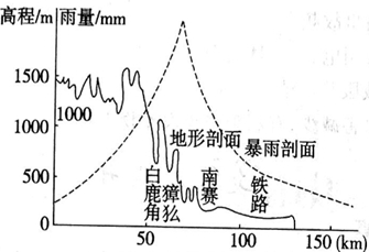 本题解析:过降雨曲线最高点,作一条平行于纵轴的直线,找出该线与地形剖面线的交点,然后再据纵轴读出该点的高度即可。