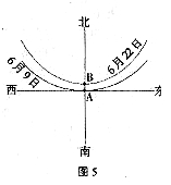 4、单选题 图5为某地6月9日和6月22 日两天太阳视运动的投影方位示意图,回答下面试题。