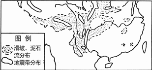 (1)根据图示:该图表示泥石流多发地主要是我国西南地区。该地区多滑坡、泥石流的原因可能是:从地形方面看,该区山地多、地形崎岖、坡度较大; 从气候方面看,该区降雨较多,特别是暴雨多;从地质条件方面看,该区属于地震多发地区,地壳活动剧烈,岩石易破碎;从人类活动方面看,该区植被的破坏和不合理的工程建设均可诱发滑坡、泥石流。
