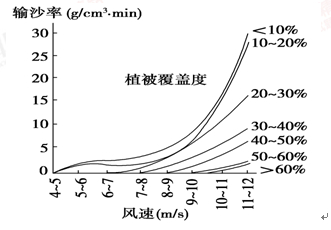 小题1:图中反映出(?) A.同一植被条件下,输沙率与风速呈负相关 B.同一风速条件下,输沙率与植被呈负相关 C.在植被覆盖度为10~20%时,风速对输沙率的影响较小 D.输沙率与植被、风速的关系不明显