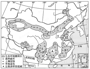 (1)下列说法正确的是(双选)? ( ) (4分) A.生态环境脆弱区北多南少 B.生物多样性锐减南方地区相对严重 C.图中生态环境问题主要分布在经济较发达的地区 D.图中生态环境问题主要分布在人类活动较强烈的地区 (2)说出A区域的生态问题及其引发的次生环境问题。(4分) (3)B、C两区域生态问题相同,危害更严重的是哪个地区?说明理由。(8分) (4)比较D、E两地区森林主要生态功能的差异。(4分)