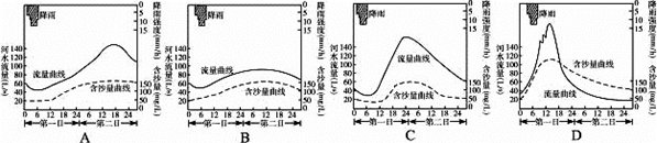 小题1:假如暴雨发生时该流域的森林早已被砍伐,河流流量曲线及含沙量曲线应为