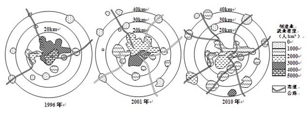 (1)据图,概述N市1996~2010年制造业空间变化的特点。(4分)