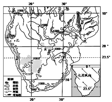 (1)气温降水的差异要从地理位置、大气环流、洋流、地形等来分析。甲比乙海拔低,甲位于低纬度大陆东岸,有暖流流经,乙位于低纬度大陆西岸,有寒流流经。海拔低气温高;暖流有增温增湿的作用;寒流有降温减湿的作用。