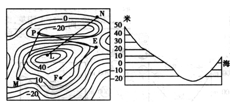 小题2:根据剖面图的海拔高度和地形起伏判断,该剖面图经过海区,地势两边高,中间低,且该剖面线经过地区中间地势最低处海拔低于-20米,故LN连线符合。