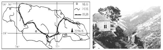 材料一 下左 图为“某岛屿示意图”,下右图为“咖啡园景观图”。