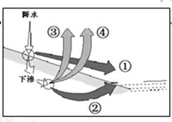 4、单选题 全球总降水的65%会下渗到土壤中,最后通过蒸发和蒸腾返回大气,称为“绿水”;其余的35%会储存于河流、湖泊以及地下含水层中,称为“蓝水”。下图中箭头表示水循环的各个环节,判断下列叙述正确的是