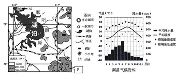 材料二:下图为鄱阳湖平原区域图和南昌气候资料图